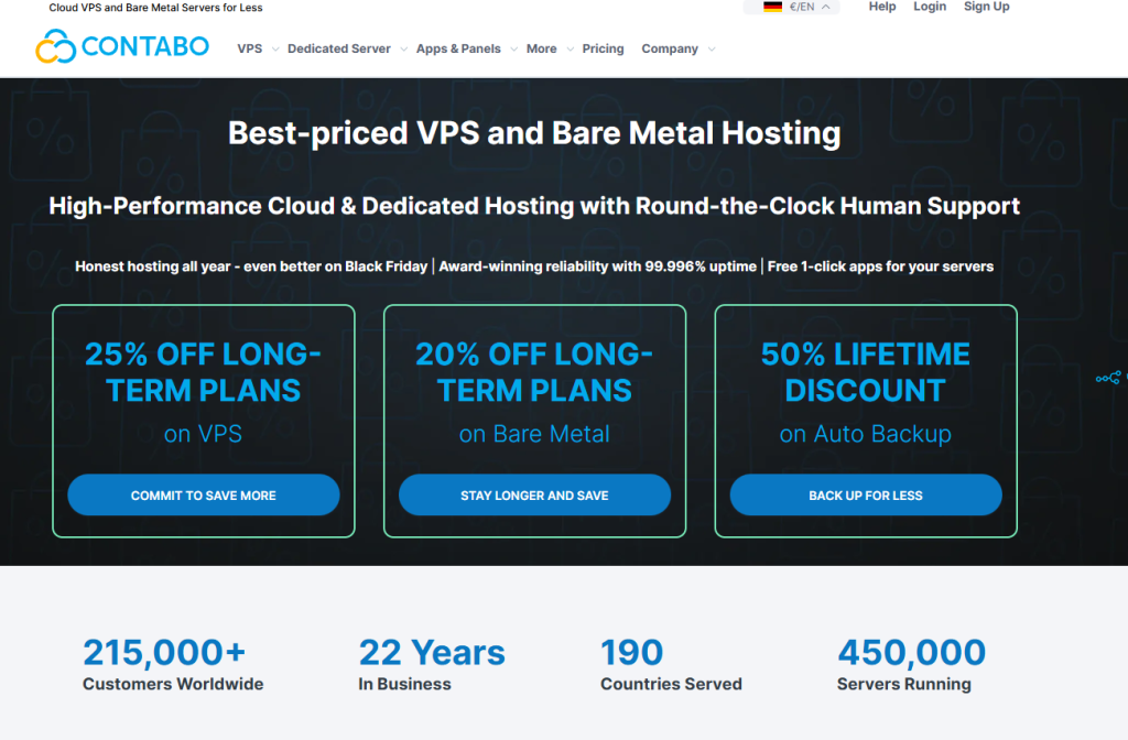 contabo正式开启了2025年的黑色星期五特别促销活动,这也是目前为止contabo出现过得最大折扣了,全场VPS一律7.5折优惠,裸金属服务器8折优惠,自动备份功能5折优惠。contabo的VPS和独立服务器分布于“德国(总部)、英国、美国(西雅图、圣路易斯、纽约)、日本、新加坡、印度”
