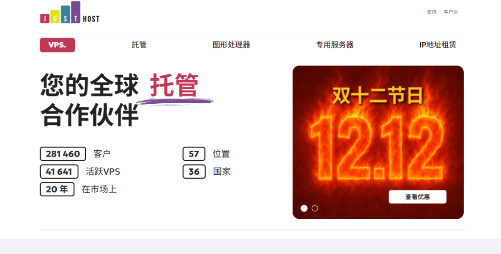 从现在开始到12月21日,justhost对中国区客户开启双十二特特促销,低至5折优惠,可选机房有:美国(西雅图、达拉斯)、德国、荷兰、瑞士、芬兰。VPS为KVM虚拟,NVMe硬盘,支持在不同机房之间切换(更换IP),根据配置从低到高给与300~750Mbps带宽,不限制流量随便跑。付款方式支持:信用卡、20多种加密货币、PayPal、支付宝、银联、PerfectMoney,15天退款保证。