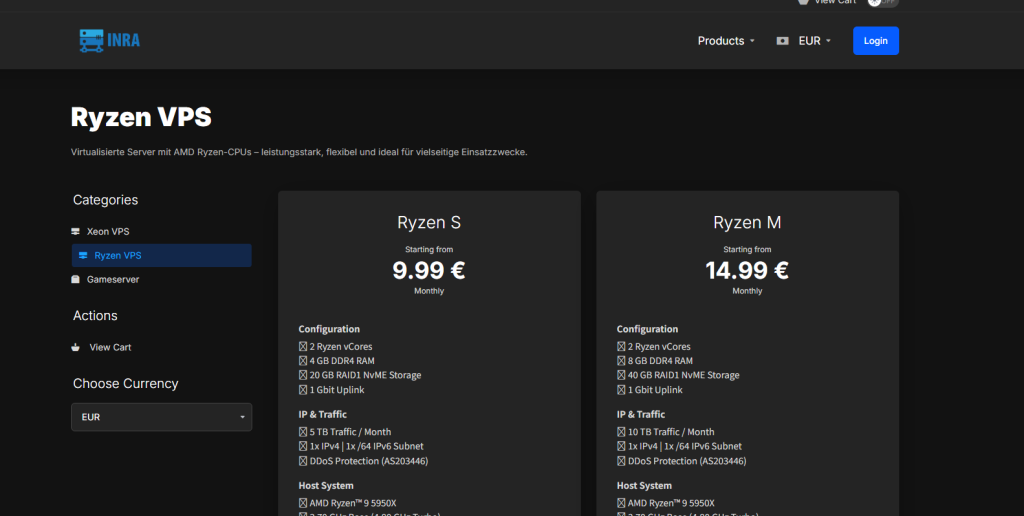 INRA,国外商家,主要提供KVM VPS和游戏主机。下面是AMD Ryzen™ 9 5950X处理器的KVM VPS,8折优惠码:LET20