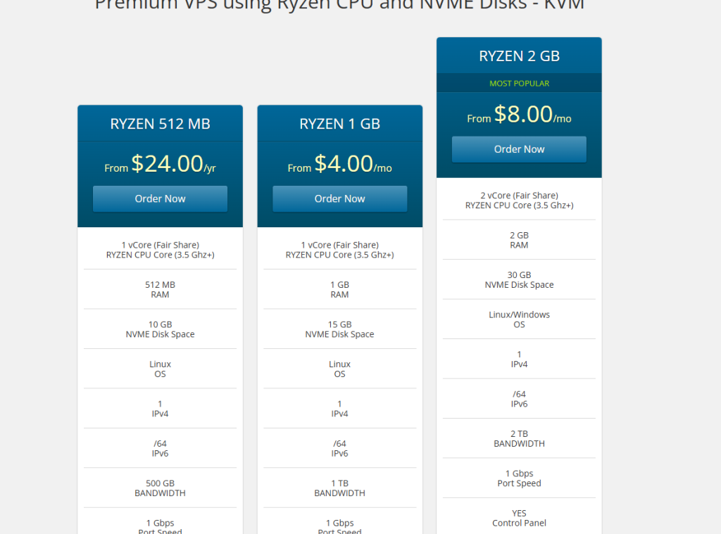 KVM虚拟,AMD Ryzen系列CPU,NVMe SSD阵列,自带一个IPv4+免费IPv6,10Gbps带宽,从4G内存起支持Windows,
