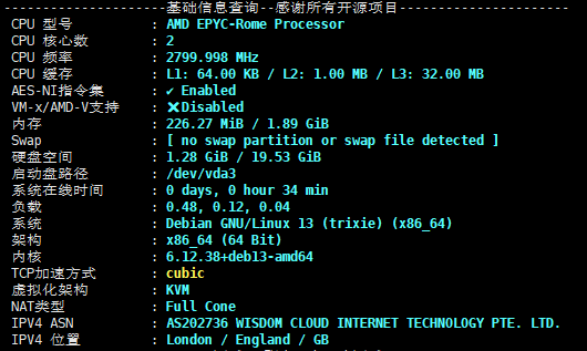 AMD EPYC 7002,主频2800MHz,底层为KVM虚拟,启用了BBR,不支持IPv6,上游提供商为wisdomisp,归属地为英国伦敦