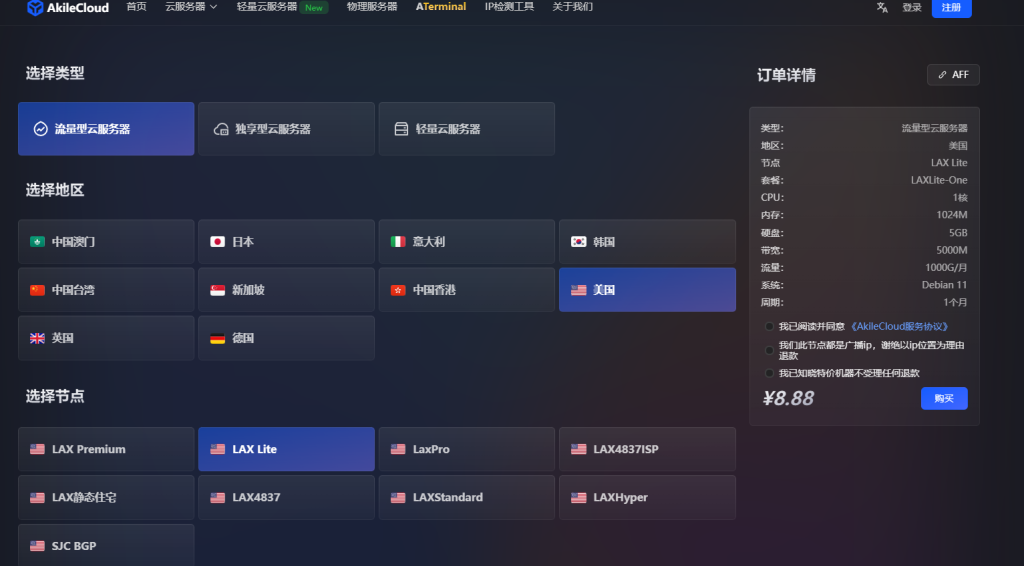 Akile,国内商家,主要提供KVM VPS,数据中心有香港、日本、新加坡、台湾、洛杉矶、韩国等等。下面是洛杉矶/国际线路线路的KVM VPS,无大陆优化。超出限速共享10Mbps不限流量。