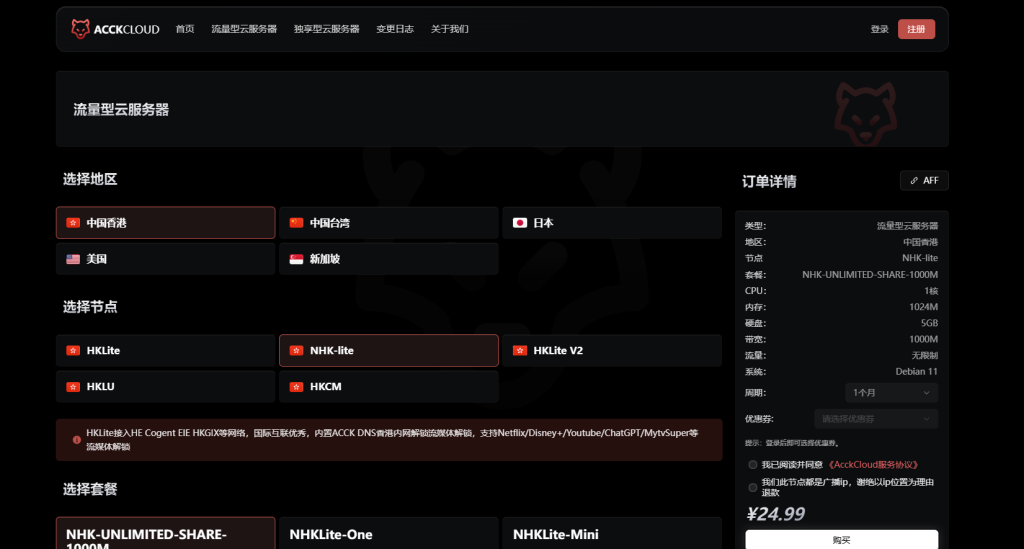 AcckCloud,国内商家,提供香港、台湾、日本、美国等地的VPS。下面是香港/国际线路的KVM VPS,特色是1Gbps端口、不限流量,澳门IP,性价比还不错。官方描述:HKLite接入HE Cogent EIE HKGIX等网络,国际互联优秀,内置ACCK DNS香港内网解锁流媒体解锁,支持Netflix/Disney+/Youtube/ChatGPT/MytvSuper等流媒体解锁