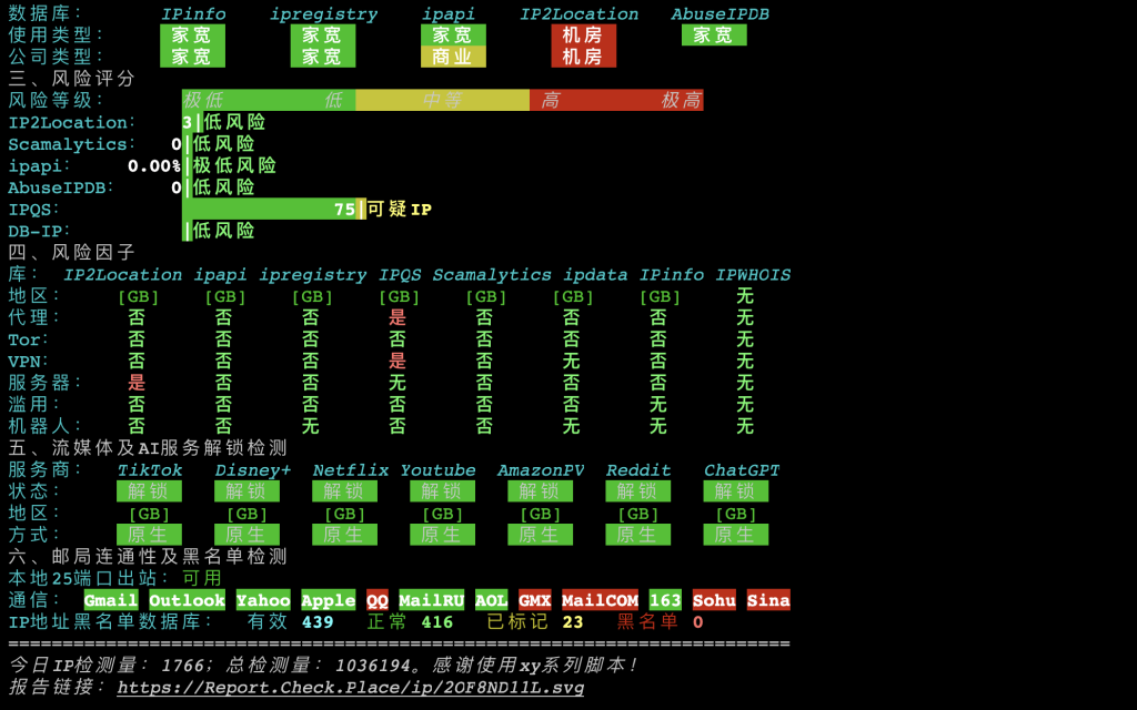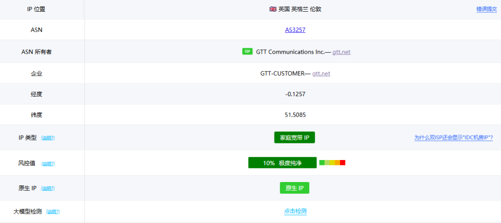IP为英国原生IP,有双ISP属性,解锁能力比较优秀,适合各种对ip需求高的业务。