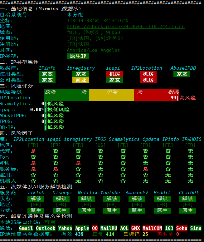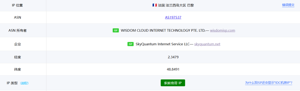 IP为法国原生IP,具有双ISP属性。