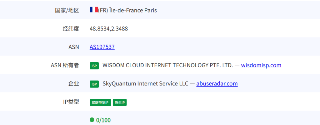 国家: FR 城市: Paris 服务商: AS197537 WISDOM CLOUD INTERNET TECHNOLOGY PTE. LTD.