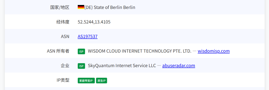 国家: DE 城市: Berlin 服务商: AS197537 WISDOM CLOUD INTERNET TECHNOLOGY PTE. LTD.
