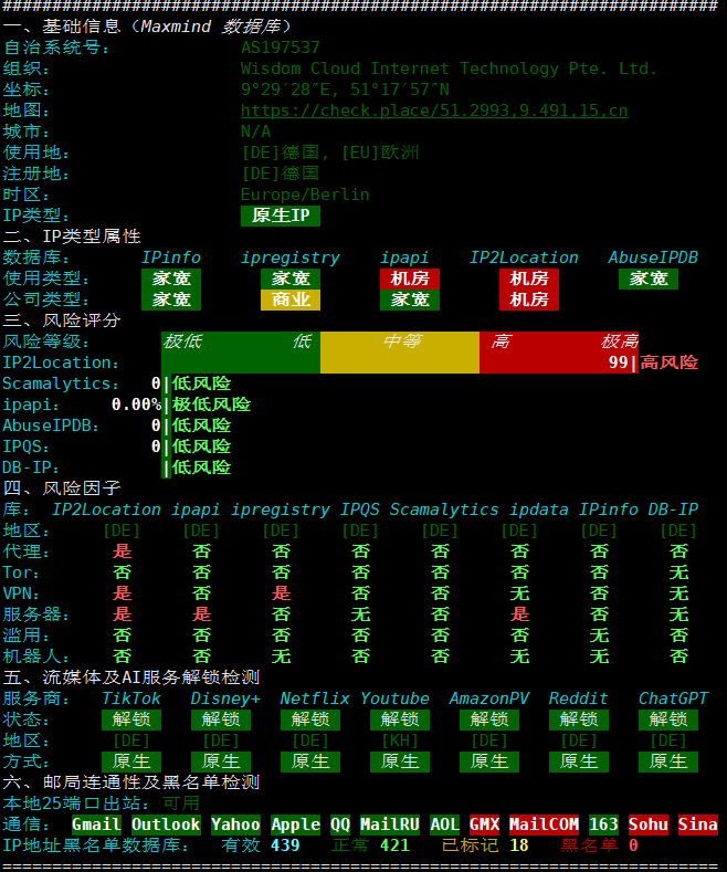 IP为德国原生双ISP属性IP,解锁能力不错,不过具体的解锁请自行参考上面的测评数据~~